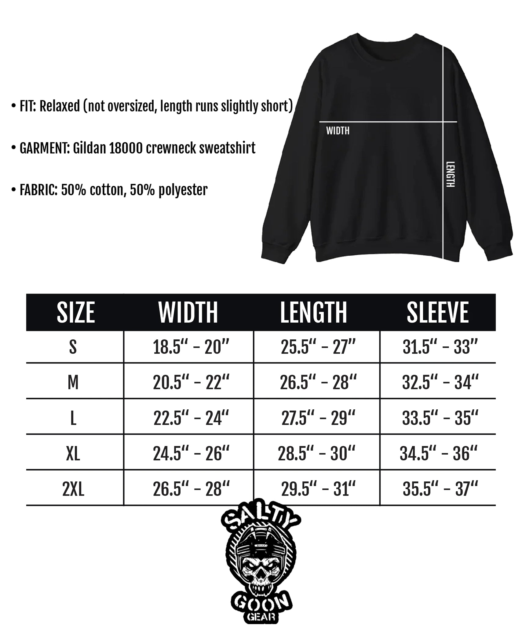 Every Salty Goon Gear sweatshirt is made to order which means we don’t do size swaps or exchanges.